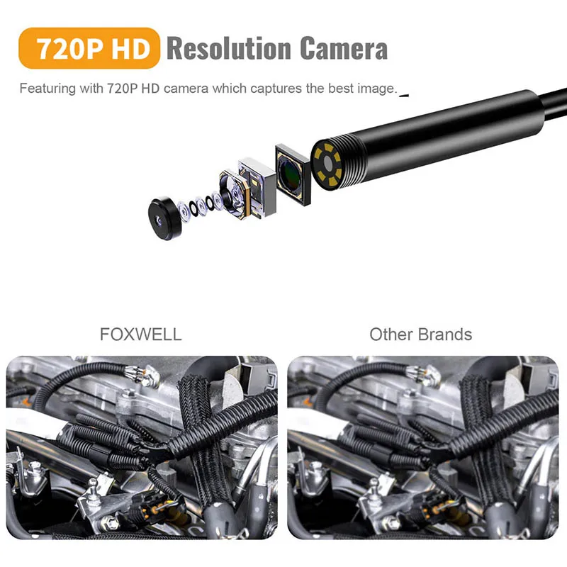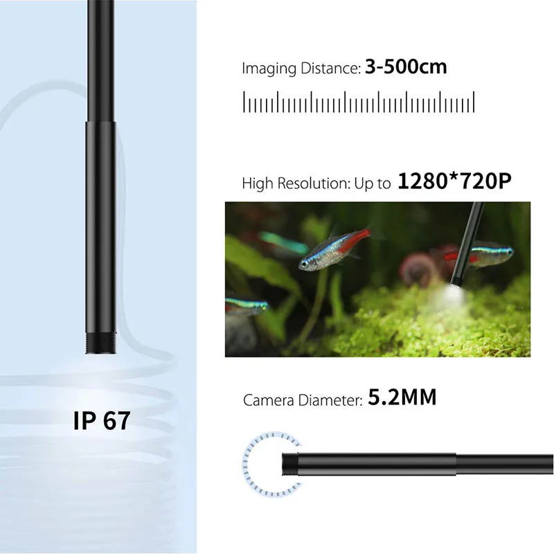 1.[Водонепроницаемая камера и Полужесткий кабель]:С полужестким кабелем достаточно долго и легко держать форму, перейти в труднодоступные области. Водонепроницаемая камера IP67, наш эндоскоп может работать с влажной средой, вы даже можете погружать его под воду.