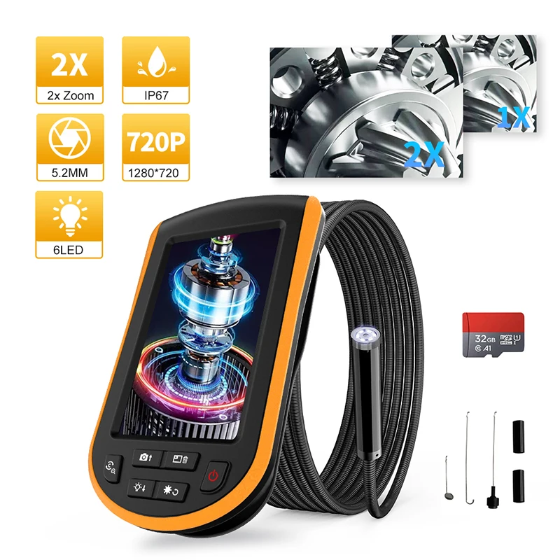 Новейшая модель; 5,2 мм цифровой промышленный эндоскоп с 4,3 "ЖК-дисплей эндоскоп 2X зум IP67 Водонепроницаемый Бороскоп с 8 светодиодный бесплатная флеш-карты памяти TF 32 ГБ