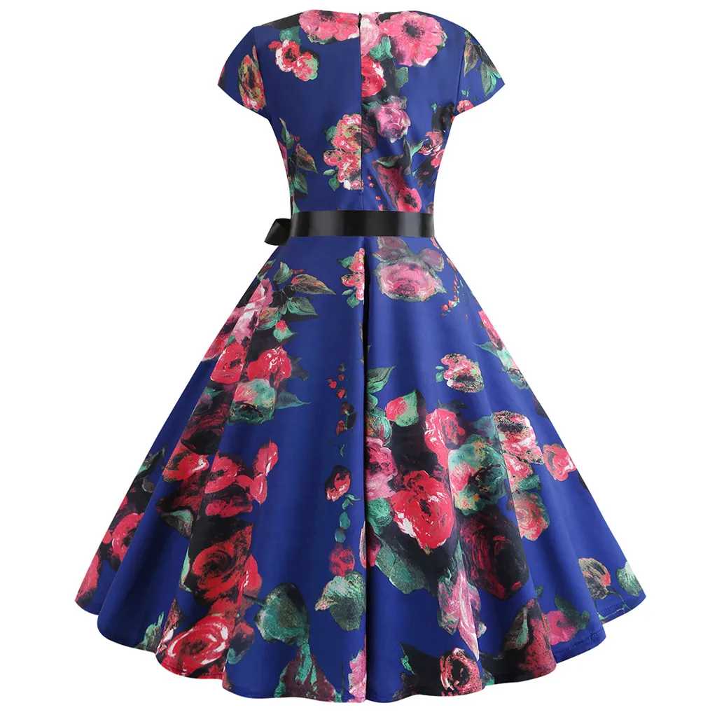 Женское темно-синее платье с красным цветком, модное элегантное Пышное Платье с круглым вырезом и коротким рукавом