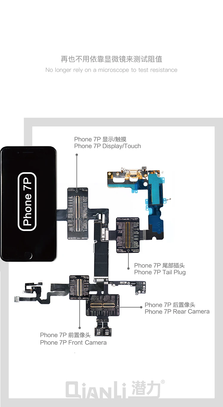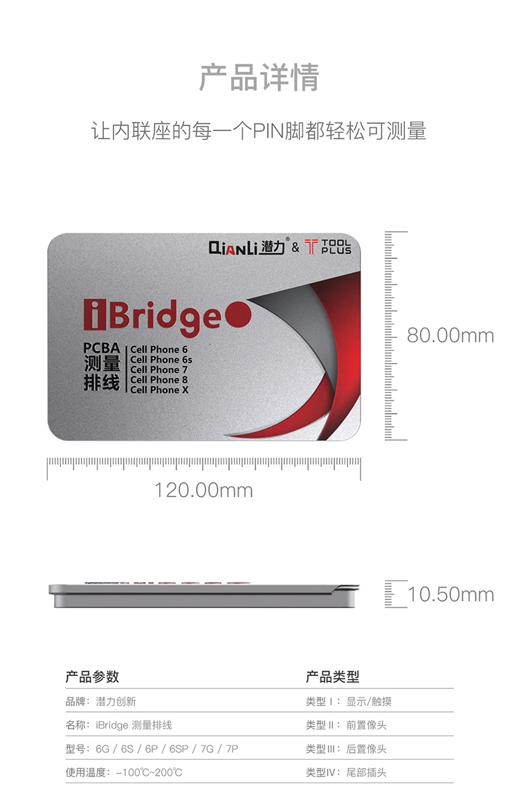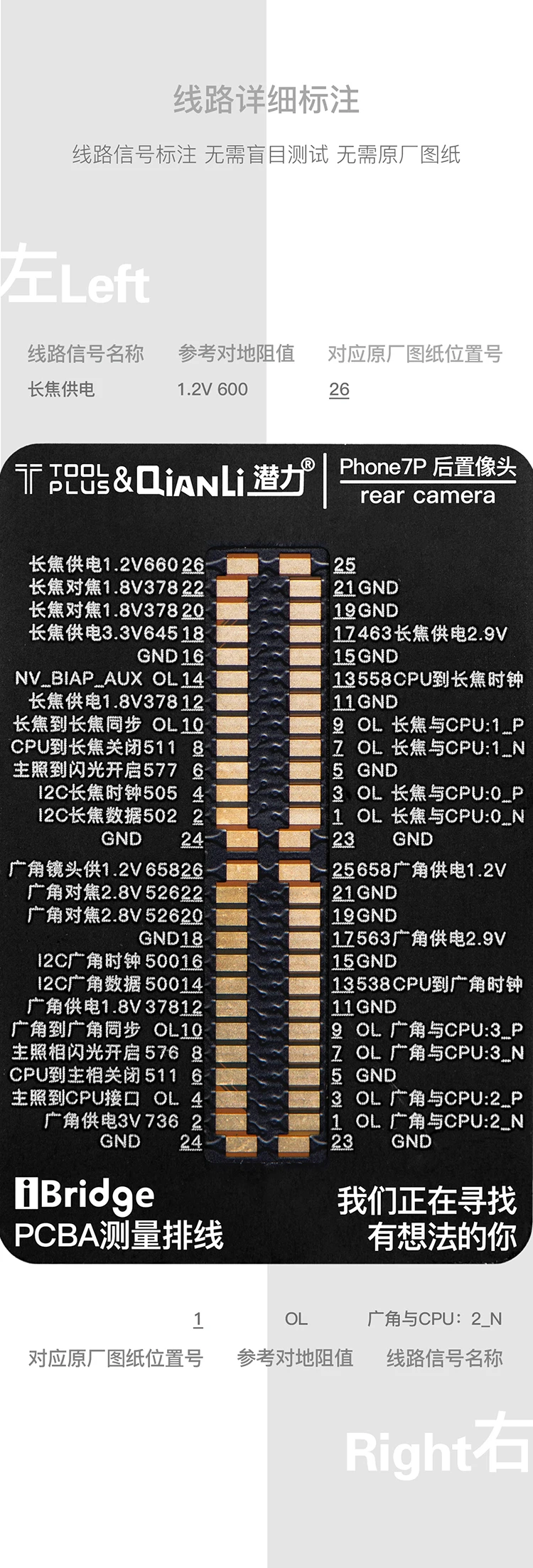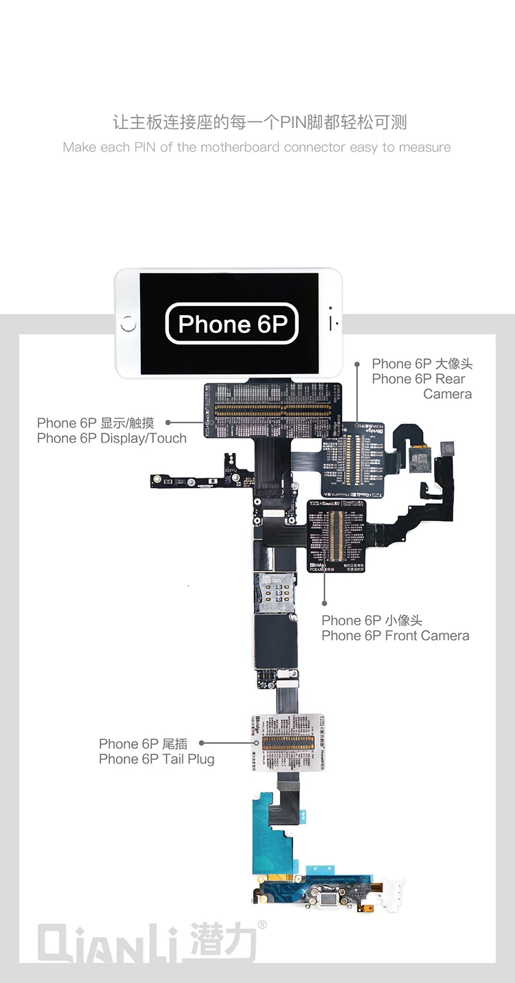 QIANLI iBridge измерения проводов сиденье для IPHONE 6 6P 6S 6SP 7 7P материнской платы Сопротивление Напряжение тестовый сигнал кабель-удлинитель Телефон Разводка платы является точным и компактный, и большинство булавки не имеют эпитаксиальный линия испытания. Например, плата не подключается к ЖК-дисплей экран. В тех случаях, когда ботинки доска не может обнаружить экран находится в пределах нормы, не следует учитывать выходное напряжение и технический персонал не может обнаружить и проверить напряжение стоимости соответствующего короткого замыкания. Этот тест для быстрой зарядки для iphone 6/6p/6s/6s p/7/7p, на каждой модели имеют 4 типа тест кабель следующим образом: камера заднего вида, фронтальная камера, разъем док-станции и сенсорный экран с сенсорным экраном. | |