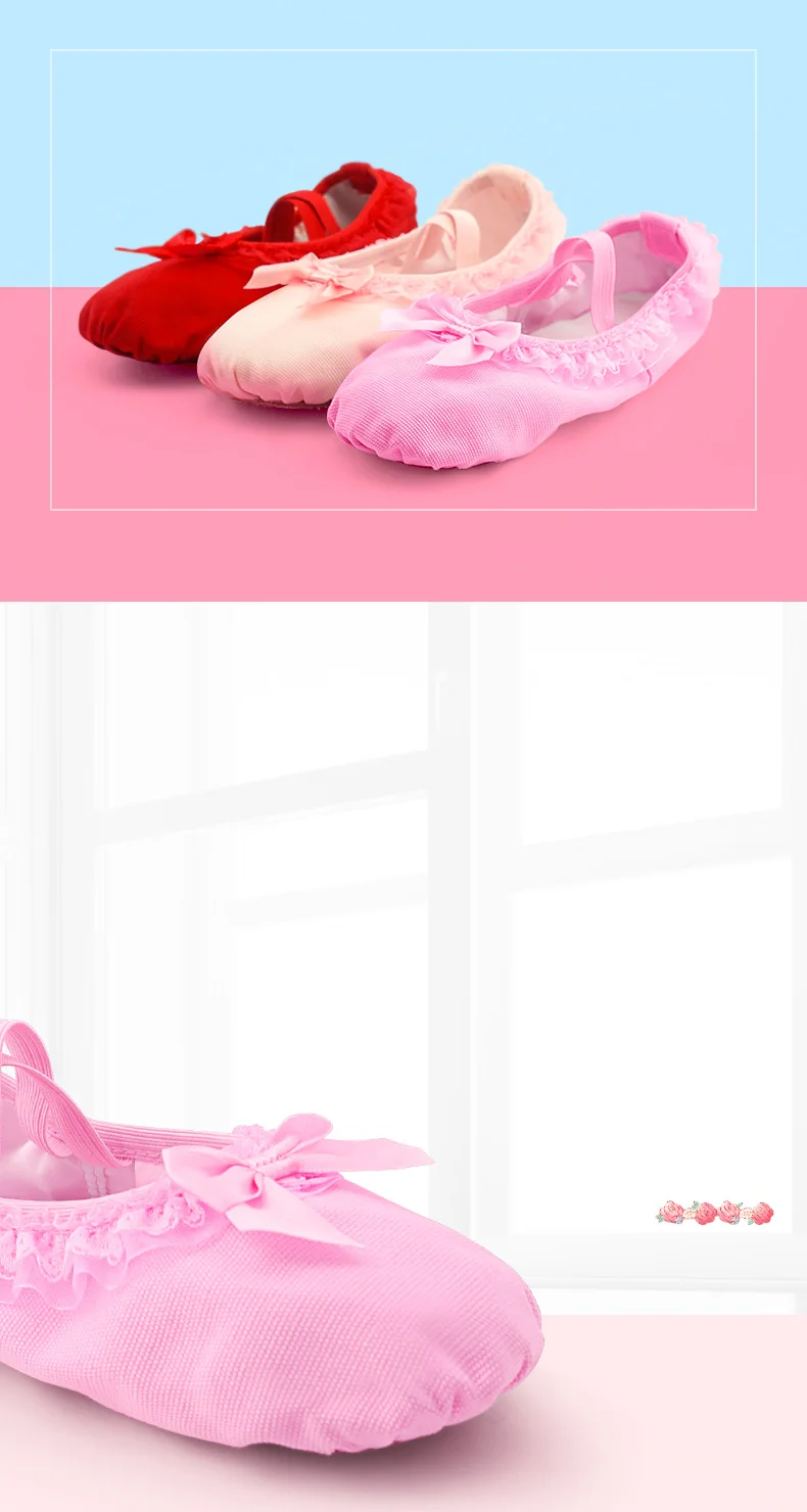 Мягкие парусиновые балетные тапочки для девочек, кружевные балетные танцевальные туфли розового цвета для детей