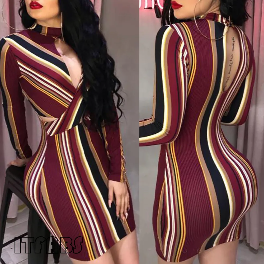 Женское сексуальное платье с разноцветными полосками, облегающее мини-платье, вечерние коктейльные платья