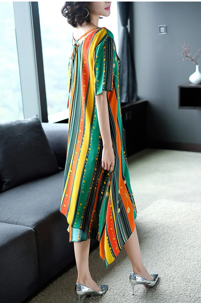 Высококачественное модное Полосатое шелковое женское платье, длинное, свободное, для похудения, 2019 Весна и лето, новое шелковое платье