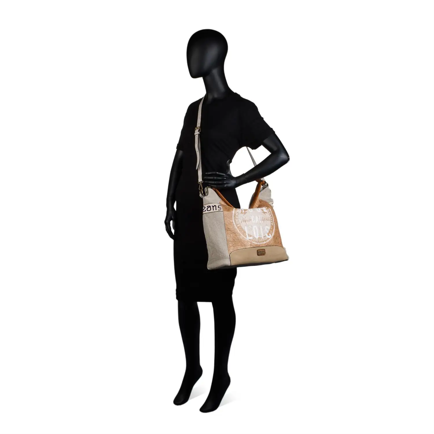 Type made handbag Hobo with shoulder Adjustable signature Lois. Exclusive Design Design. With handle TOTE extra. Organizer for phone. Compartment back with zipper. Ideal for daily use. Lining stamping and inner pocket with zipper. Reinforced base. Wear resistant. Materials and high quality's sewing. Keychain BRand. Dimension: 41x35x13 cm. Material: Canvas-Synthetic Leather leatherette.
