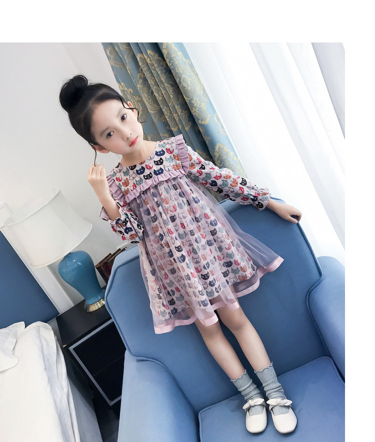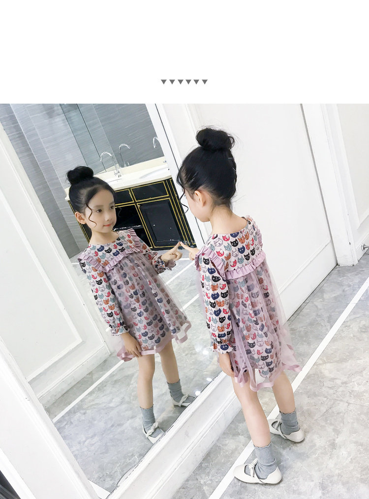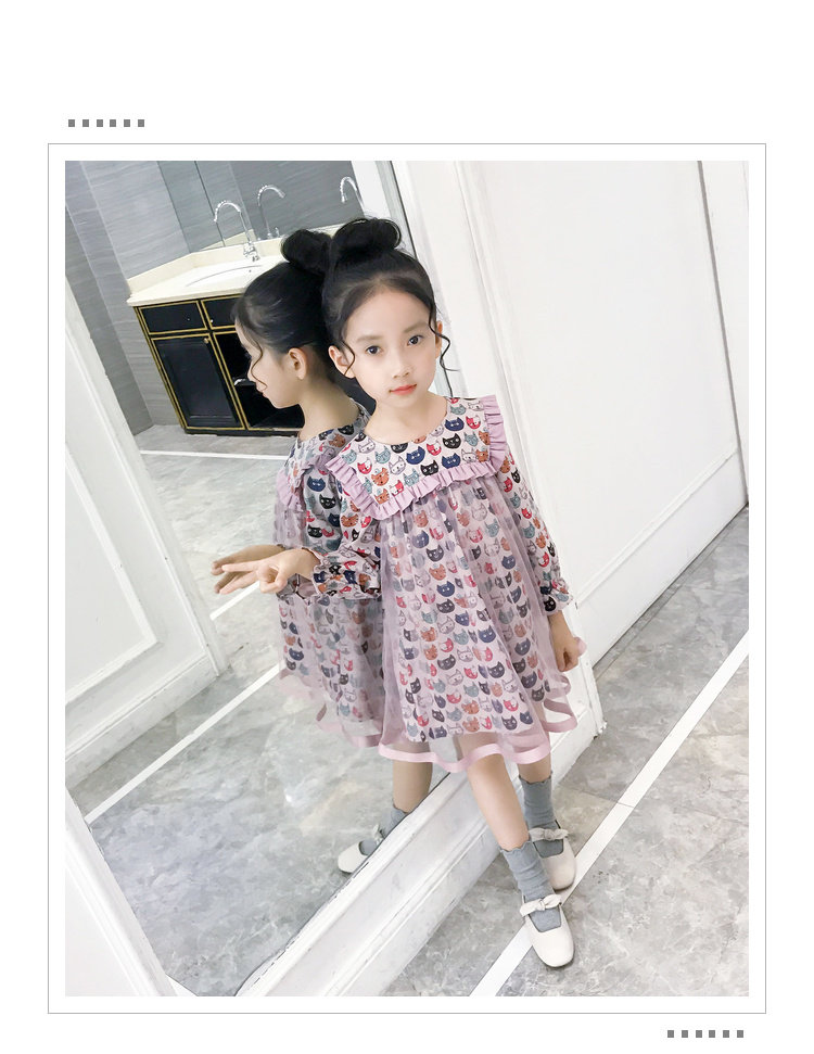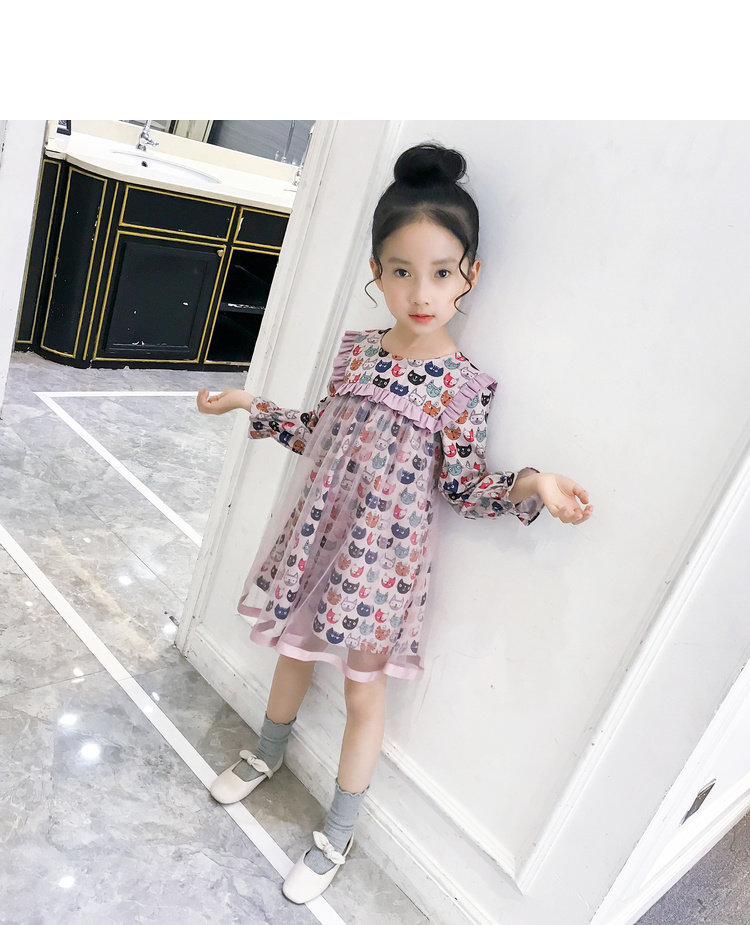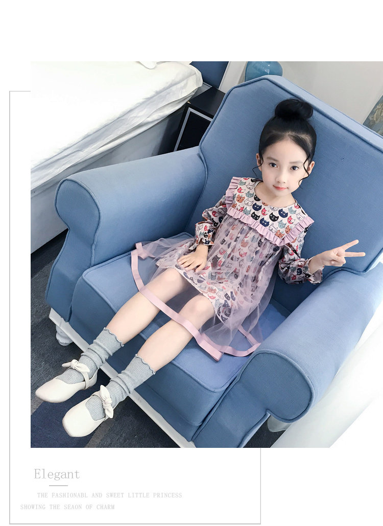 Модное платье-рубашка для девочек, лето 2019, с рисунком кота из мультфильма, с сеткой, в стиле пэчворк, с длинным рукавом, корейская модная одежда, элегантная, Коктейльная, для детей