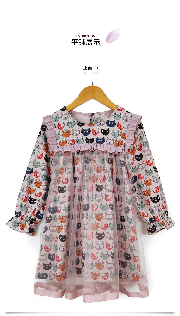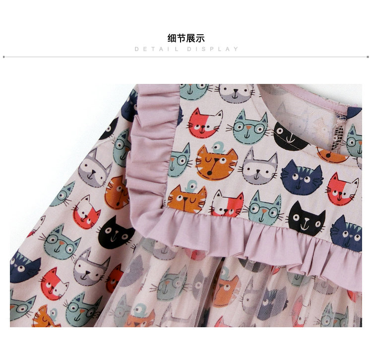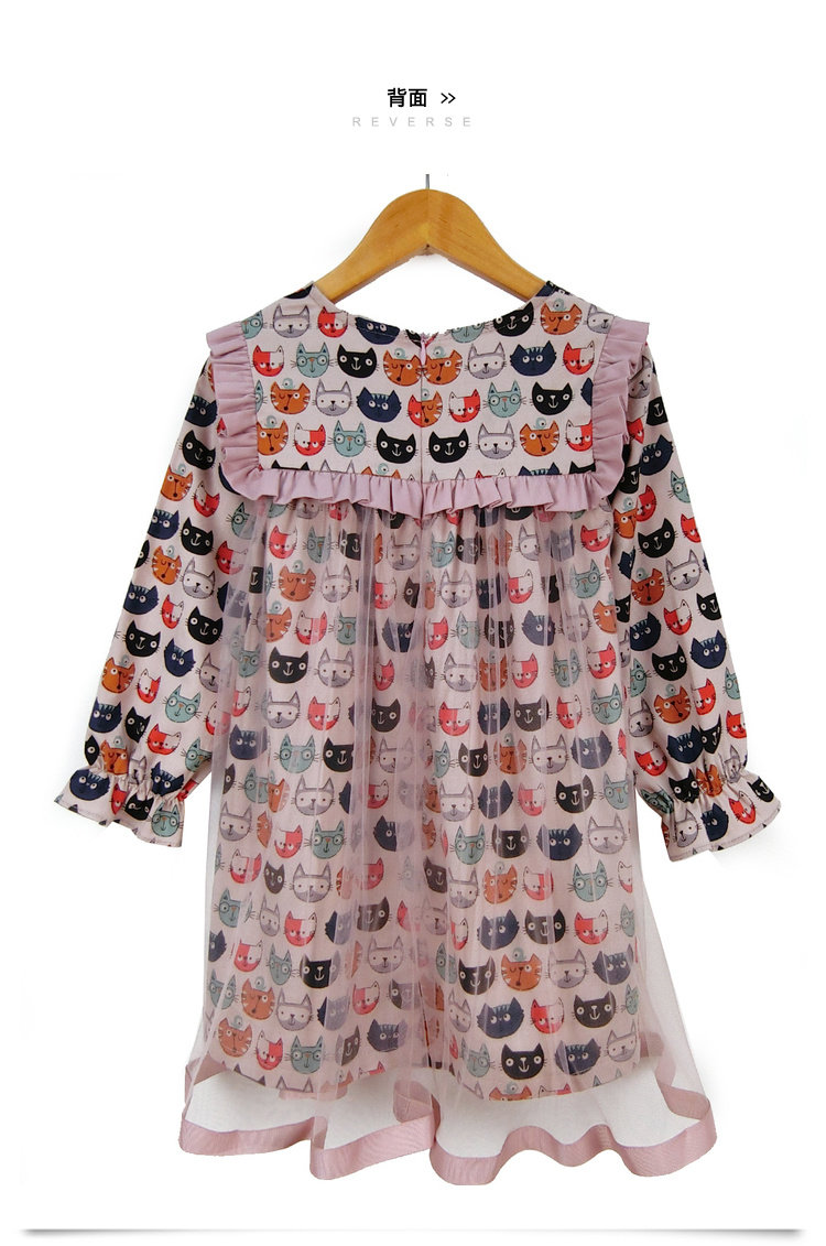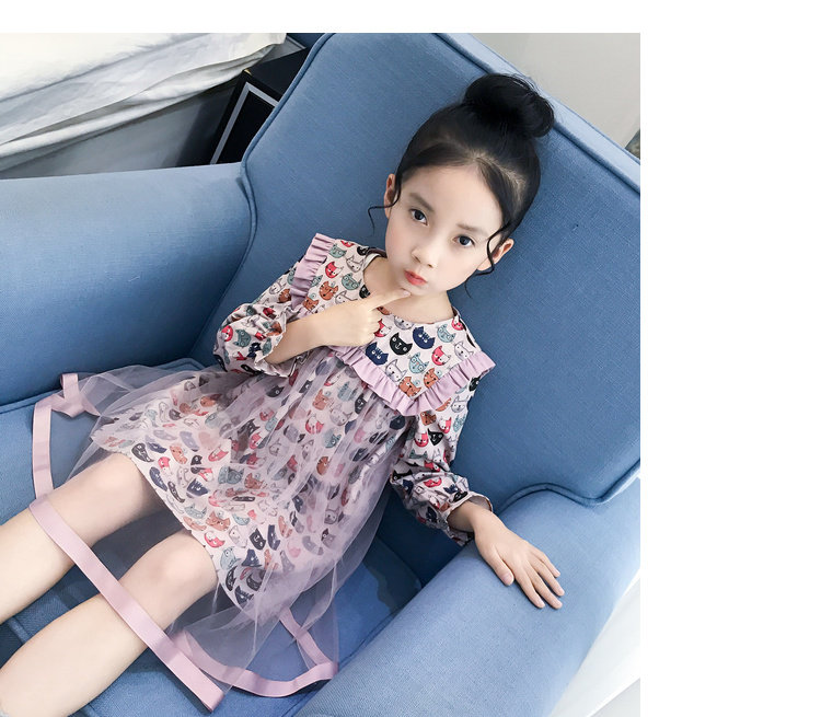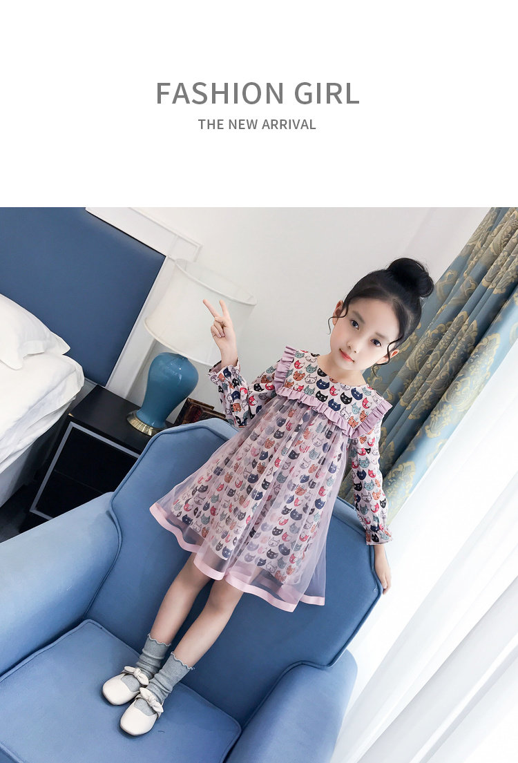 Модное платье-рубашка для девочек, лето 2019, с рисунком кота из мультфильма, с сеткой, в стиле пэчворк, с длинным рукавом, корейская модная одежда, элегантная, Коктейльная, для детей