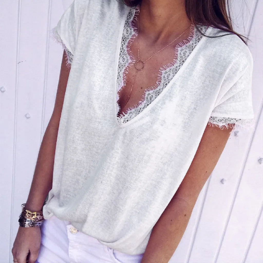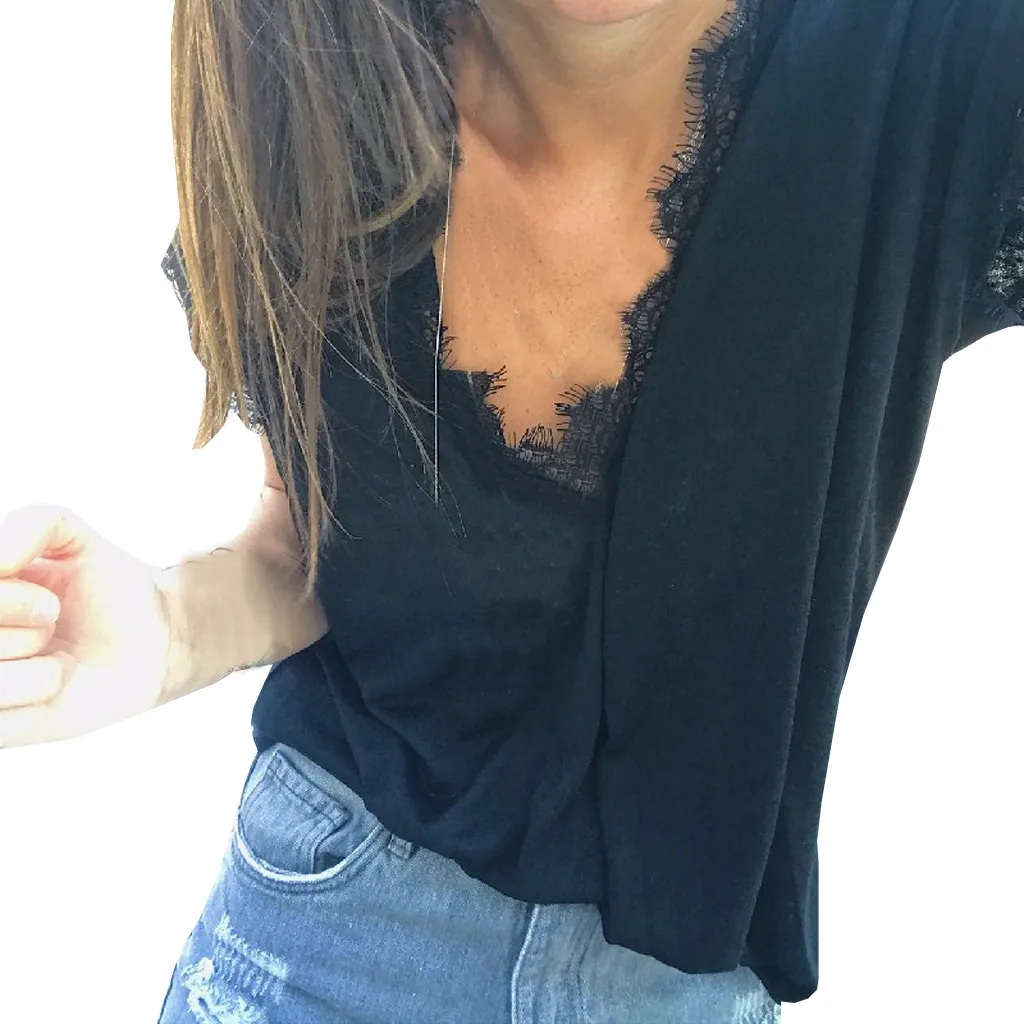 Женские летние повседневные кружевные топы с коротким рукавом и v-образным вырезом, футболки, блузки