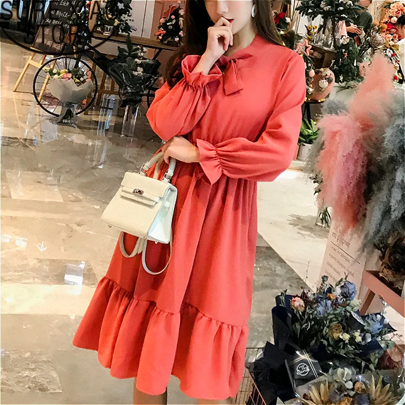Women Dress 2021 Bow Above Knee Mini Dot Full A-Line Office Lady Chiffon Dresses Empire Ladies White 3418 50 | Женская одежда