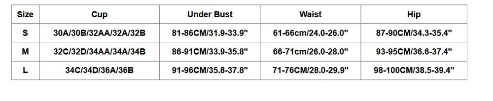 | M | 32C/32D/34AA/34A/34B | 86-91CM/33.9-35.8" | 66-71cm/26.0-28.0" | 93-95CM/36.6-37.4" |