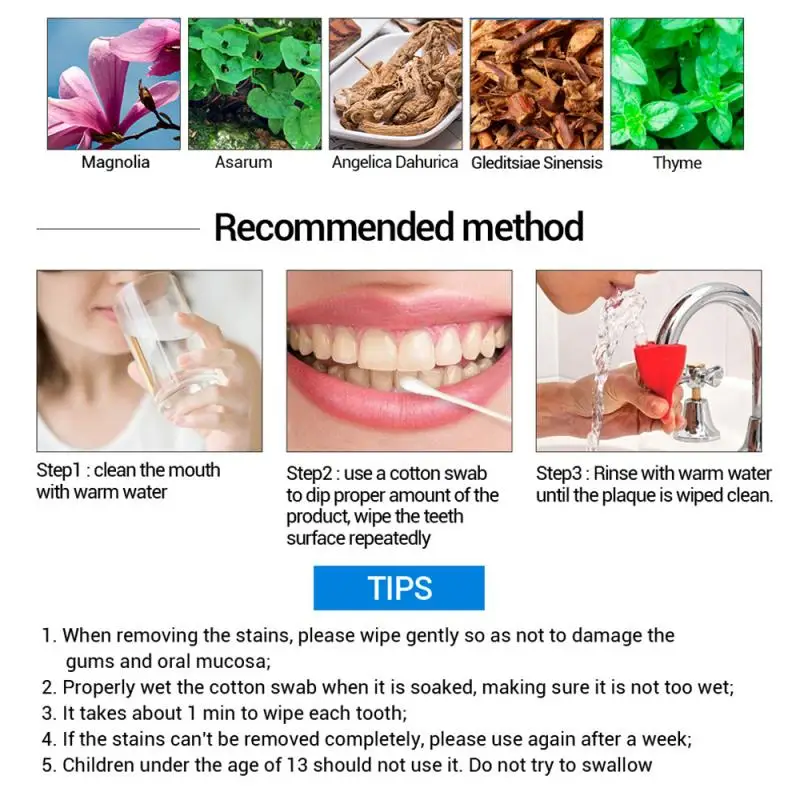 Как использовать: Перед использованием, пожалуйста, очистите рот теплой водой, затем Используйте ватный тампон, чтобы окунуть необходимое количество продукта, повторно протрите поверхность зубов перед зеркалом. Краску в теплой воде, пока налет не протерется.