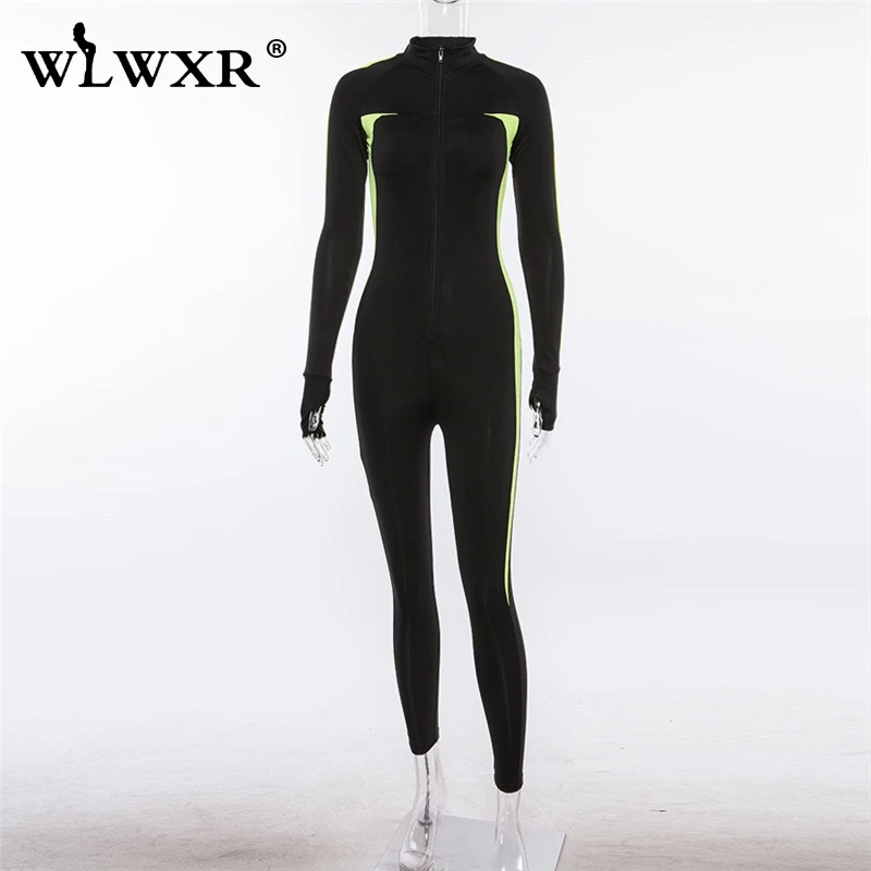 WLWXR облегающий Летний комбинезон с длинным рукавом, женский комбинезон, женский комбинезон в стиле пэчворк на молнии, черный женский облегающий сексуальный комбинезон для женщин