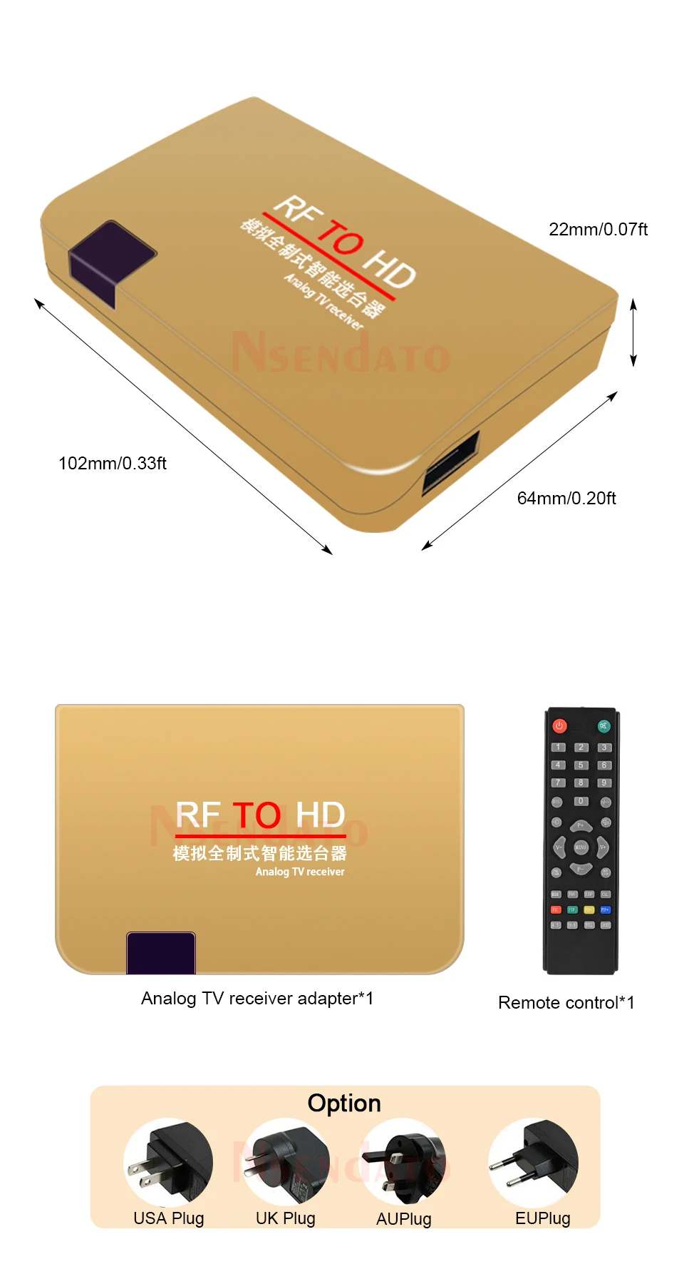 Detail:1. Insert the TV cable (enter the closed route of analog TV signal);2. Plug the HD cable of the TV set into the HDinterface of Nsendato receiver, and the other end into the HD in interface of the TV set;3. Turn on the TV, use the signal switching function of the TV remote control, and select the HD signal input mode;4. When the receiver power is plugged in, use the supporting remote control to start the machine. Press the MENU button in the middle of the receiver's remote control -- right move button -- -preset button -- press the down move button -- automatic preset search -- and then right click to start searching. (P+/- is up and down, V+/- is left and right and is the confirmation key)Features:1. Simple operation, convenient, clear display, volume and channel operation in the selector window display.2. The receiving signal is stable and reliable, and can receive and store 251 channel TV programs, which can meet the needs of the cable TV network in the future.3. Wide voltage range (110-240V) of switching power is adopted, high efficiency, low heating, safe and reliable.4. Equipped with remote control shutdown, regular shutdown, and 10 minutes without signal automatic shutdown function.5. Suitable for all TV sets with HD input port. Suitable for projectors, multimedia teaching, network engineering, etc.6,working frequency :48.25MHZ--865MHZ