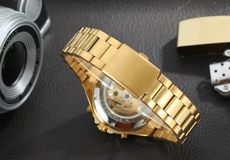 Описание: -Корпус часов из нержавеющей стали и ремешок для часов делают часы более прочными. -Дизайн циферблата со скелетом подчеркивает Вашу модную точку зрения. -Водонепроницаемость 3 АТМ подходит для ежедневных нужд. -Механический механизм с автоматической обмоткой позволяет носить часы в любое время. -Цвет может не отображаться так же, как в реальной жизни из-за различий между компьютерными мониторами и разницы в цвете глаз. Спецификация: -Диаметр: 4,4 см (1,73 ") -Толщина: 1,6 см -Длина ремешка часов: 21,0 см -Ширина ремешка: 2,0 см (0,8 дюйма) -Механизм: самобматывающий механический -Ремешок часов: нержавеющая сталь -Корпус часов: нержавеющая сталь -Водонепроницаемость: 3 АТМ, не подходит для плавания, душа. В комплект входит: Спецификация: -1 x механические часы Напоминание: 1. Перед использованием снимите все пленки. 2. Пожалуйста, держите часы подальше от магнита, чтобы избежать остановки работы часов. 3. Пожалуйста, Сверните часы перед каждым использованием