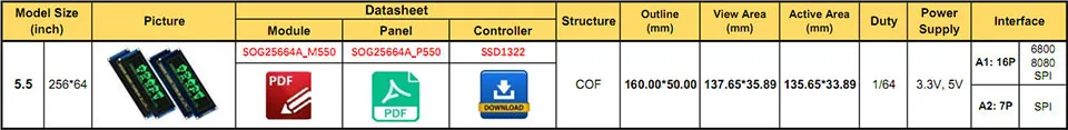 | Основная информация ➤ Модель Размеры. : 5,5" Model номер модели: SOG25664A Type тип продукта: Графический oled-модуль ➤ Торговая марка: Surenoo Format Формат дисплея: 256*64 точек Interface интерфейс: проверьте таблицу IC или эквивалент: SSD1322 или равный Dimension Размер контура: 160,00 (Ш) x50,00 (в) x6.30 (Т) мм Visual визуальная площадь: 137.65x35.89мм Active Активная область: 135.65x33.89мм ➤ IC посылка: обвязочная ➤ Питание (Тип): 3,3-5,0 V Инструкция по PM-OLED коду ![]() |