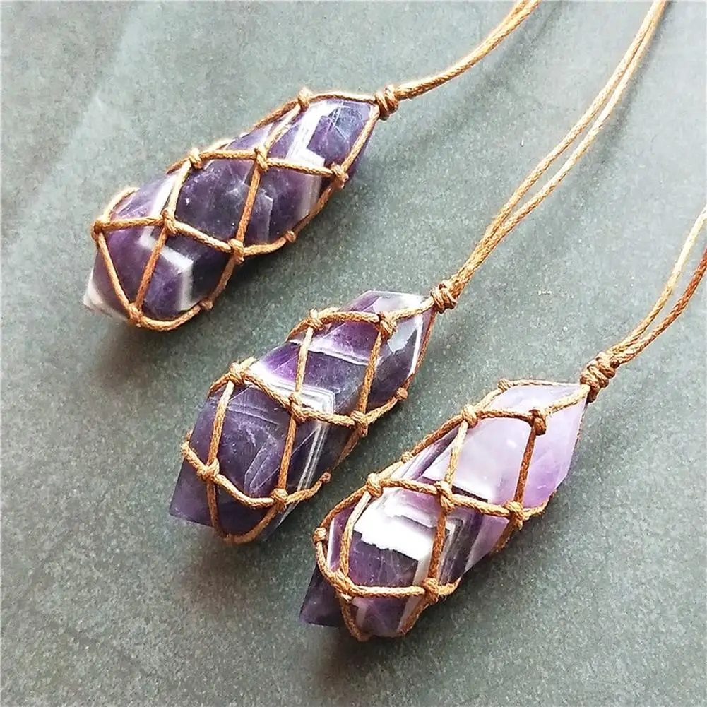 Шестигранные ожерелья, подвески из натурального кристалла, розовый кулон с фиолетовым камнем, Кожаные Цепочки, ожерелье для женщин, ювелирные украшения