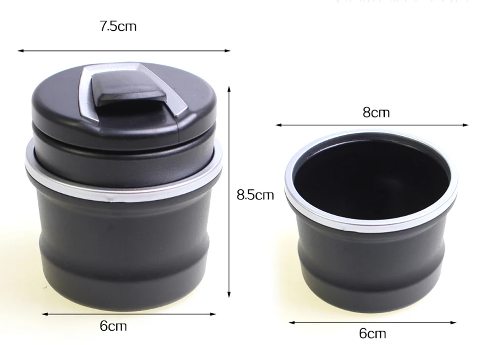 2 в 1, портативный автомобильный пепельница, ящик для хранения, светодиодный Особенности: 1. Используется Высококачественный АБС-пластик, прочный. 2. Банки черного матового тела после обработки, поверхность очень тонкая. 3. Уникальный съемный дизайн, съемная пепельница и твердые частицы в баке. 4. Точность анти-дым утечки прокладка дизайн, герметичность, Отваливается так быстро, эффективно предохраняет от случайного опрокидывания пепельницы. Технические характеристики: Материал: АБС-пластик + сплав Использование: пепельница, мусорный бак Размер продукта: 8*7,8*6,2 см Батарея: 4 x1. Литиевая батарея 5 В (встроенный) Посылка включает в себя: 1 x пепельница Советы: Когда вы выходите из транспортного средства, убедитесь, что дыма внутри кузова выветрился