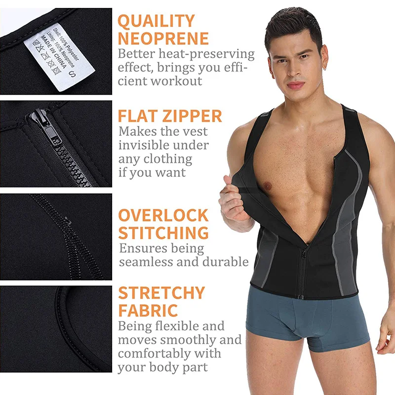 Эластичный неопреновый жилет для похудения Чем больше вы потеете, тем больше теряете. Вы сжигаете в любом месте от 300 до 500 калорий за 20 до 30 минут с помощью тренажера для поясницы сауны, что равно 5 фунтов. Жилет для похудения помогает подтянуть живот и укрепить живот Жилет для сауны с молнией усиливает пот в вашем сердце в 3 раза больше, чем обычная одежда для спортзала, костюм для сауны плотно прилегает к вашей середине, окутывая волшебство от ваших плеч до линии талии, работает как триммер для талии, помогает осанке спины и пресса во время тренировки 10-миллиметровый неопрен не только выделяет тепло и сумасшедший пот во время тренировки, но и сохраняет ваше тело в тепле в холодные дни с минимальным термопокрытием, если вы работаете в холодном месте, вы можете оставаться в тепле при ношении этой майки для сауны Мужской корсет, тренировочный жилет можно носить под любой обычной рубашкой или поверх нее, невидимый жилет для тренажера для сауны, не видно его под рубашкой во время тренировки, пожалуйста, выберите черный Двусторонний тренировочный жилет для мужчин не сильно воняет после длительного использования, легко чистить и стирать вручную, Повесьте на улице, чтобы сушить на воздухе
