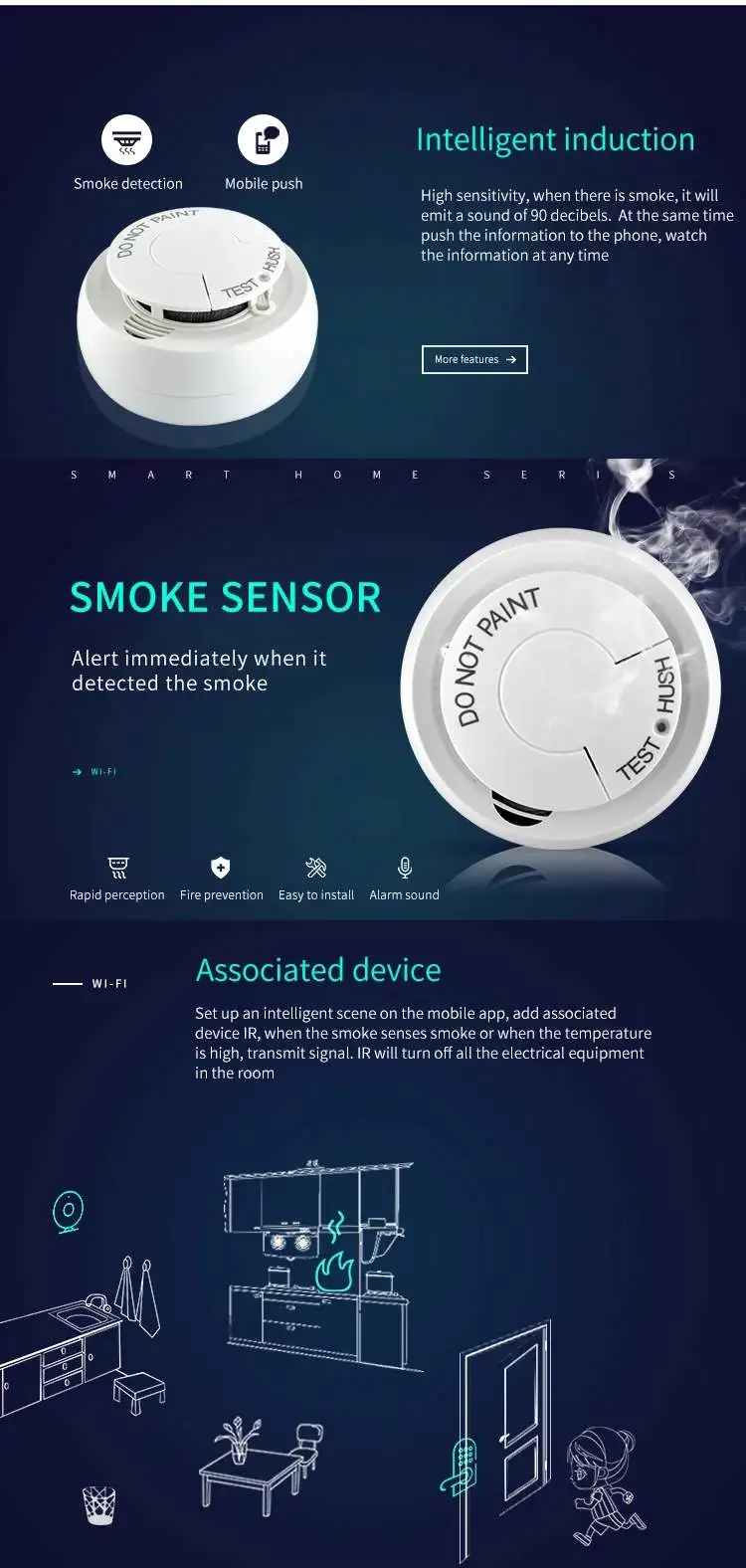 Этот продукт, именуемый Wi-Fi детектором дыма, срабатывает сигнализация (далее-детектор), обнаруживает дым парой инфракрасных диодов.
