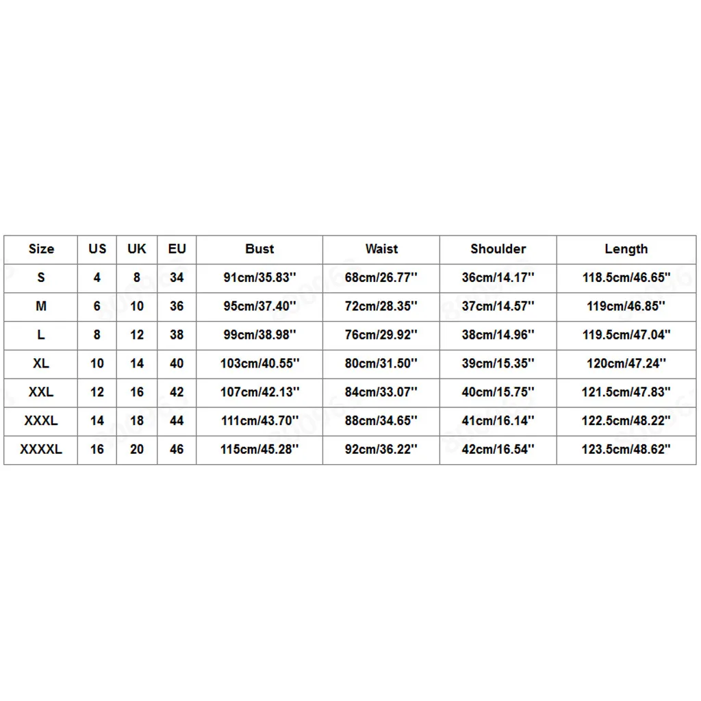 | Размеры: XXXXL | Свяжитесь с нами: 16 | Великобритания: 20 | ЕС: 46 | Бюст: 115 см/45,28 дюйма | Талия: 92 см/36,22 дюйма | Плечо: 42 см/16,54 дюйма | Длина: 123,5 см/48,62" |