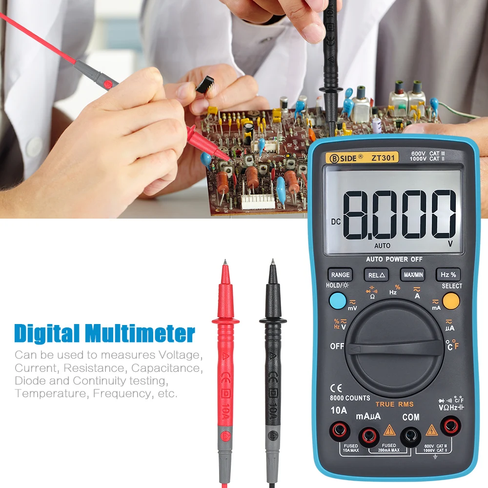 Это многофункциональный цифровой мультиметр с функцией автоматического определения диапазона и true RMS с ЖК-дисплеем на 8000 отсчетов. Этот мультиметр является очень практичным инструментом для электриков, любителей и общего бытового использования. Он может измерять напряжение переменного/постоянного тока, переменного/постоянного тока, сопротивления, емкости, частоты, рабочего цикла, температуры, диода и непрерывности.