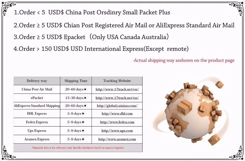 1. Заказ <5 USD Почта Китая Oedinary Small Packet Plus 2. Заказ> = 5 USD Почта Китая заказной авиапочтой Или AliExpress Стандартная доставка 3. Заказ> = 5 USD Epacket (только США, Канада, Австралия) 4. Заказ> 150 USD Международный Экспресс (за исключением удаленного) | |||
