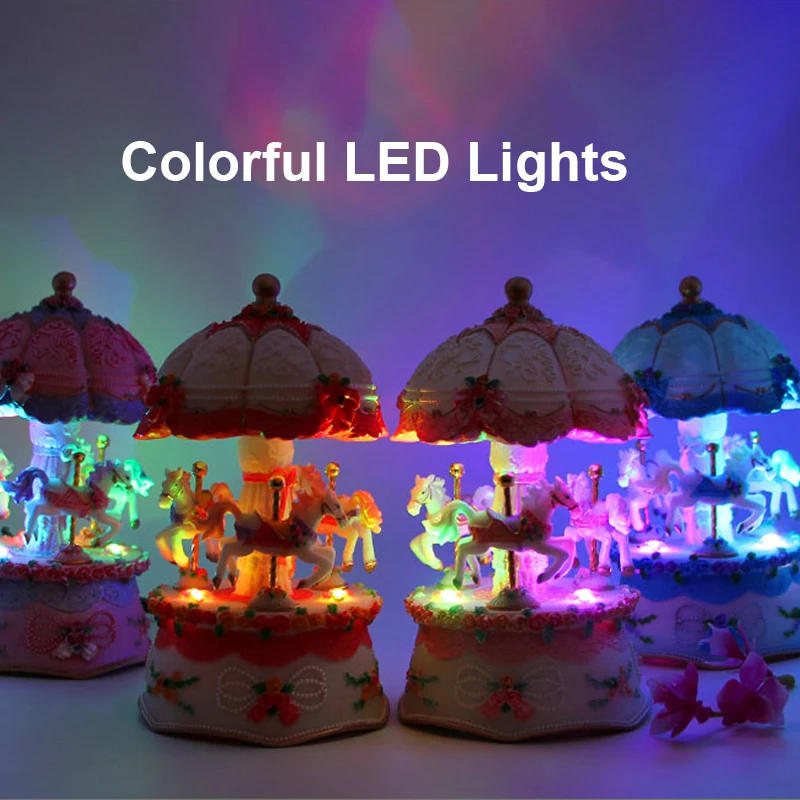 Эта музыкальная шкатулка Карусель очень красива с вращающимися лошадками и мигающий светодиодный светильник. Изысканная музыкальная шкатулка для ваших друзей, родителей, девочек или себя в подарок.