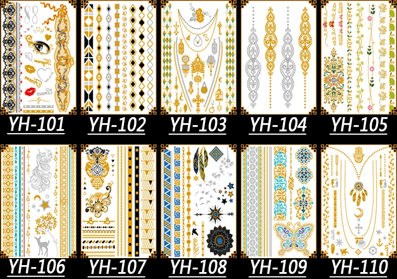 Это 10 листов Premium Metallic татуировки из хны временный металлический Вспышка татуировки Временная подделка Ювелирные Татуировки 160 Shimmer конструкции в цвета: золотистый, серебристый для фестивалей/вечерние