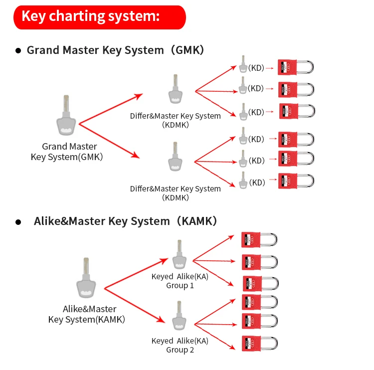 KA-P38SR1 | Keyed Alike | Steel | “KA”: Each padlock is keyed the same in one group “P”: Straight edge plastic lock body “S”: Steel shackle Other material can be customized: “SS”: Stainless steel shackle “BS”: Brass shackle |