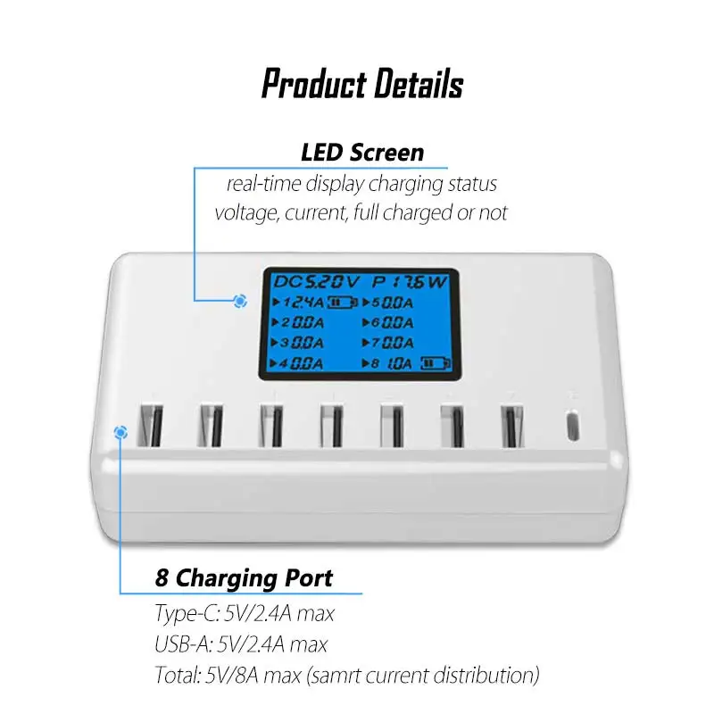 Быстрый 2.4A Смарт USB порт зарядки s: каждый порт зарядной станции распознает точные текущие требования подключенного устройства и обеспечивает нужное количество тока для безопасной и быстрой зарядки. (Не поддерживает порт Qualcomm Quick Charge)ЖК-дисплей: Интеллектуальный определяет и показывает состояние тока и зарядки для каждого порта зарядки на экране. Зарядный ток до 2,4 ампер на порт или 12 ампер в целом.Широкая совместимость: Совместимость с iPhone, iPad, Samsung Galaxy, сотовыми телефонами, планшетами, камерами, eReaders, bluetooth-гарнитурами, блоком питания, MP3 /MP4 плеером, дронами и т. д. Идеальная многопортовая зарядная станция USB для нескольких устройств с питанием от usb.Мульти Безопасность и защита: встроенная защита от перегрева, перезаряда, перегрузки по току, перегрузки, перенапряжения, короткого замыкания в Мульти usb зарядном устройстве, автоматически защищает ваши устройства и значительно продлевает срок службы батареи ваших устройств.![]()