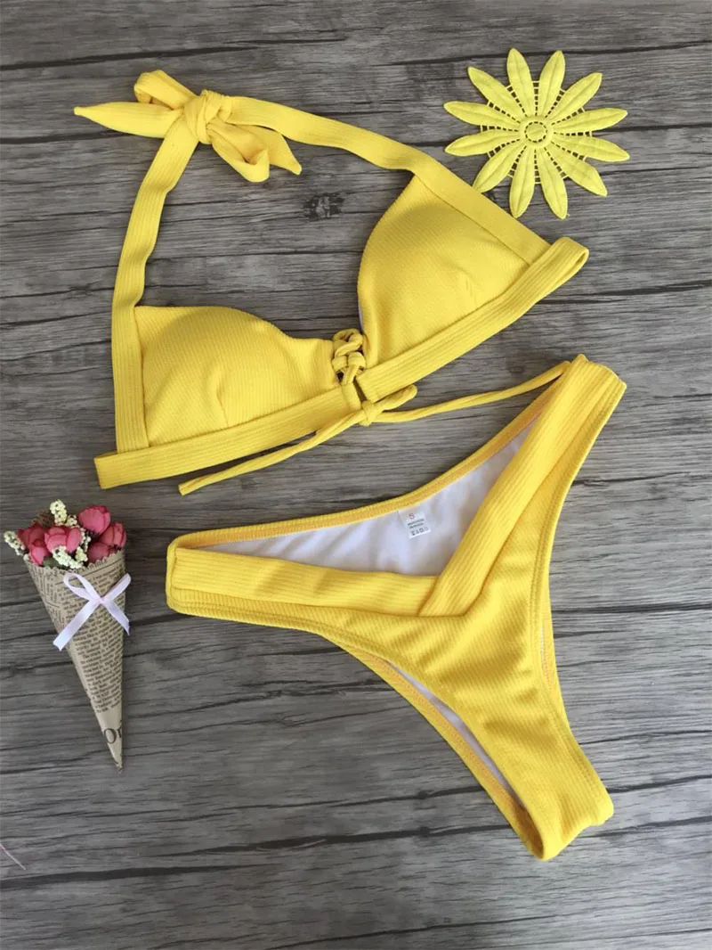 Сексуальный женский комплект бикини Купальники пуш-ап Мягкий V Бикини плавки Briazilian летние женские пляжная одежда с бретелью через шею Купальник белый розовый