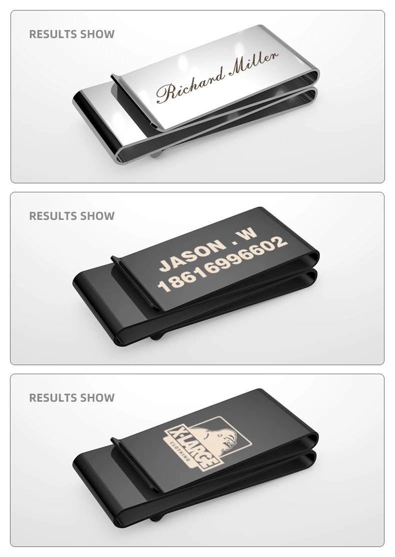 Дорогой друг, мы можем сделать уникальный зажим для денег для вас, мы можем выгравировать ваш логотип, имя, телефон и т. Д. На нем, только нужно $0,8-1,6 для гравировки, пожалуйста, свяжитесь со мной, чтобы скорректировать цену, если вы хотите, спасибо!