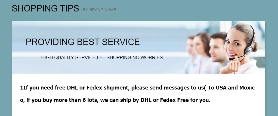 1. Для бесплатной доставки мы используем AliExpress стандартную доставку Или Почта Китая вам зарегистрированную авиапочту: товар (ы) <& = 2 кг. 2. Мы отправим товар в течение 3-7 рабочих дней после получения оплаты. 3. Каждая посылка будет иметь номер отслеживания для вашего отслеживания. 4. Обычно доставка в большинство стран занимает 10-25 дней. В некоторые страны или сельские районы это может занять еще больше времени из-за отсутствия частых авиалиний и осмотра таможней. 5. Если вы хотите товар (ы) быстро прибытие, мы будем использовать EMS или DHL или UPS, которые обычно занимает 3-5 дней, но должны быть оплачены дополнительно $20. 6. Если у вас есть какие-либо особые требования, не стесняйтесь обращаться к нам!