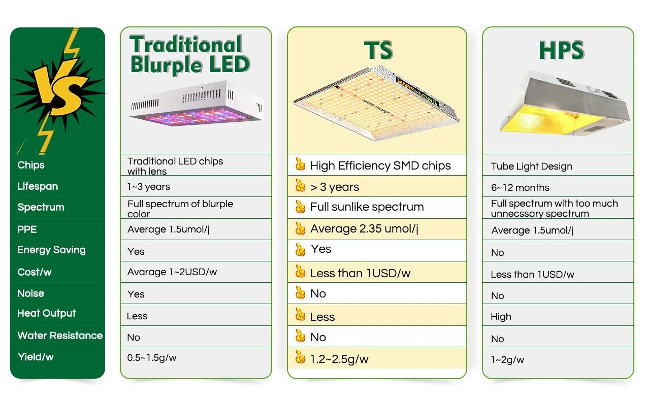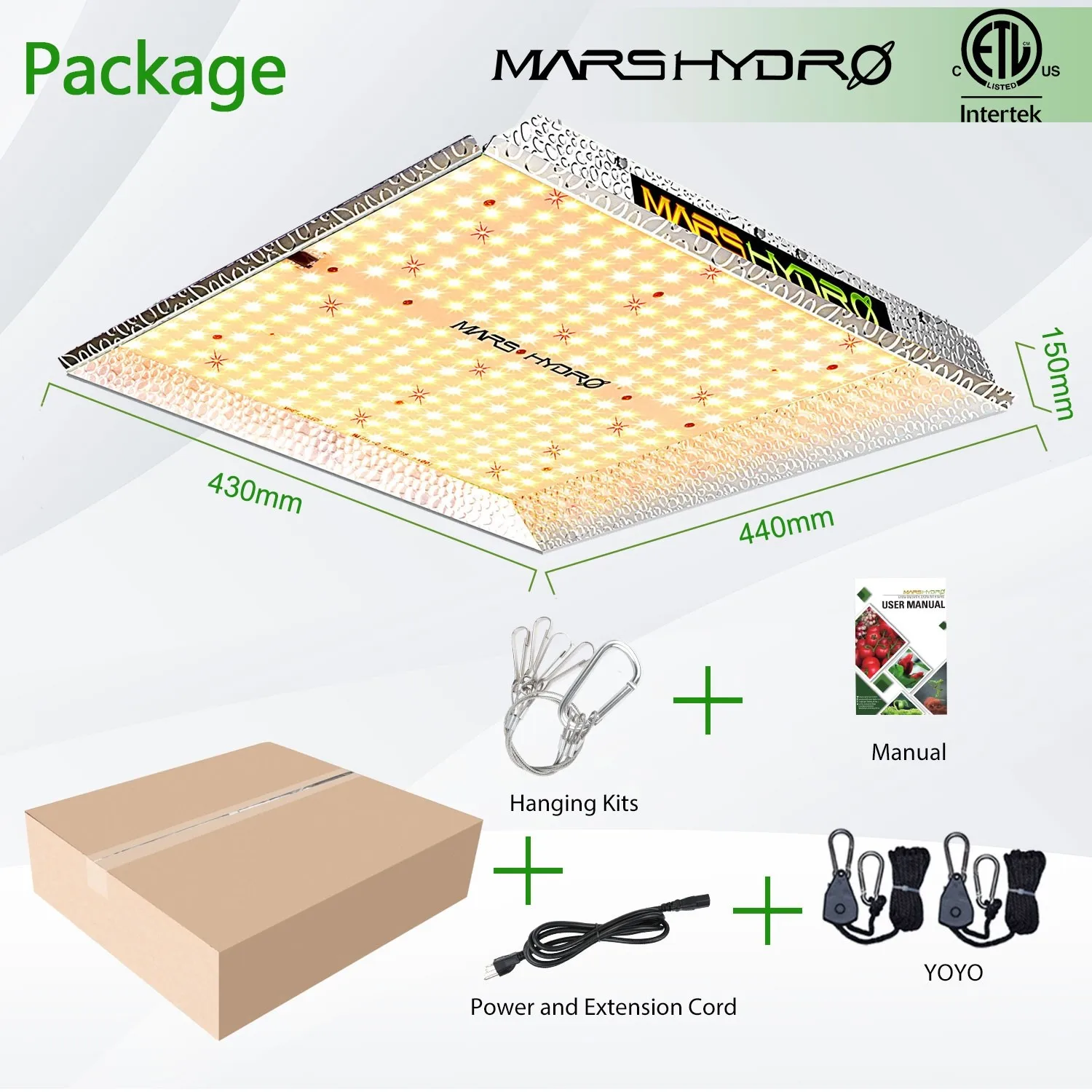 ➦ Светодиодный светильник для выращивания в помещении TS 1000 предназначен для замены двухсторонней 250-ваттной HID-лампы. ➦ Полный спектр, высокая эффективность, белый свет, квантовые платы с 660-665nm, 3200k-4200k, 5200-6800k ➦Это устройство имеет регулируемую яркость, мощность в диапазоне от 45 до 150 Вт, излучает 743 ммоль/с света и может похвастаться выдающейся эффективностью 2,3 ммоль/Дж.