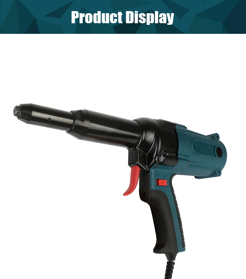 Параметры продукта Название продукта: электрический пистолет для слепых заклепок Клепки Технические характеристики: ¢ 3,2 мм-5,0 мм подходит для всех материалов/Тип Глухие Заклепки Номинальное напряжение: 220 В Частота: 50 Гц Номинальный ток: 1,9a Номинальная входная мощность: 400 Вт Область применения: автомобили, контейнеры, самолеты, треки Рабочее Тяговое усилие: ≤ 8000N