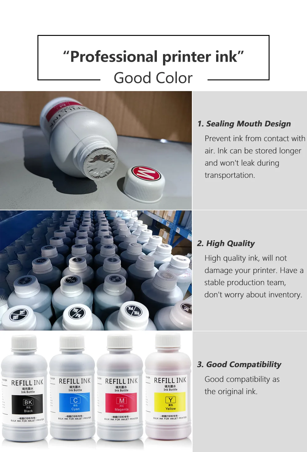 Dongguan ocструйный принтер расходных материалов Co., Ltd является высокотехнологичной компанией, специализирующейся на НИОКР, производстве, продажах и обслуживании на совместимый расходный материал для печати. Мы внедрили передовые технологии производства и управления, чтобы обеспечить качество и экологически чистый цифровой расходный материал для печати. Компания имеет независимый бренд «OCINKJET». Бизнес-проекты: чернила, чернильные картриджи s, чипы чернильных картриджей, непрерывная система чернил, продукты серии чипов decryption card. Они на 100% совместимы с Epson, для Canon, для HP, для Roland, для Mimaki, для принтеров Brother. Кроме того, мы также предоставляем комплексное обслуживание OEM с нашим брендом на внутреннем и внешнем рынке, что позволяет нам быть сильнейшим резервным копированием наших клиентов. Наши клиенты имеют подлинное партнерство в предпродажном, продажном и послепродажном обслуживании. В духе «качества для доли рынка и репутации для развития» мы стремимся к философии прагматизма, инноваций, целостности и коммуникации. «Продвижение вперед и продвижение со временем» является основой нашего развития.