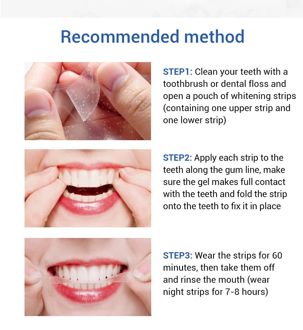 Шаг 3: Носите полоски в течение 60 минут, затем снимите их и промойте рот (Носите ночные зубные отбеливающие полоски в течение 7-8 часов)