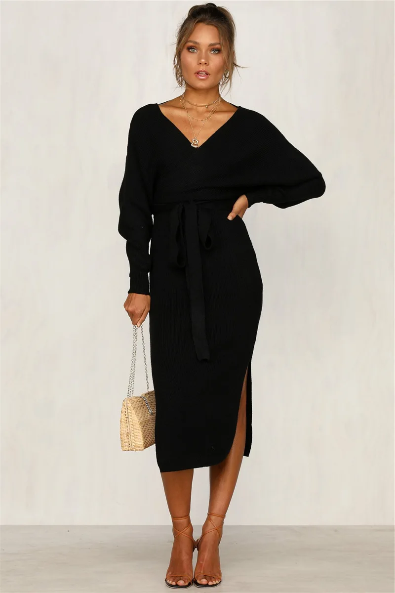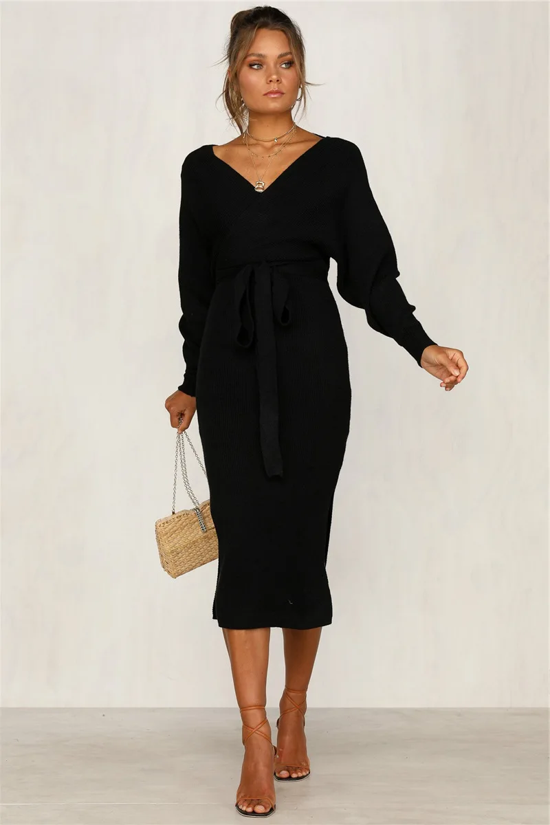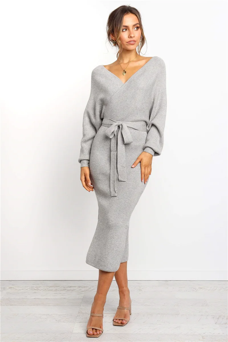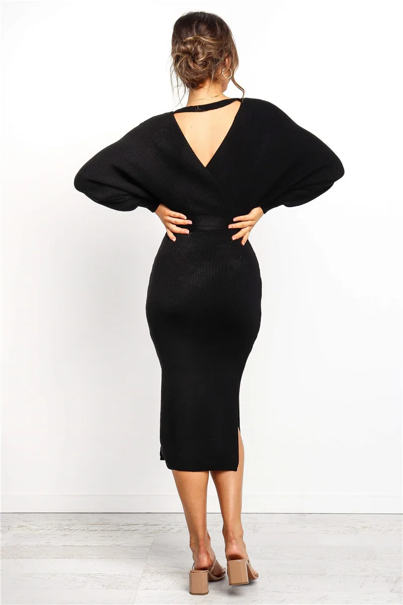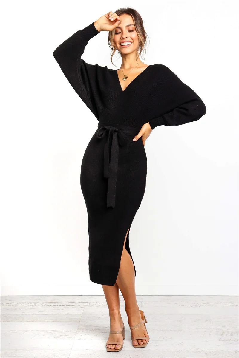 BUENOS 2019 autumn winter new women's sexy V-neck sweater dress female loose female long bat sleeves solid knitting midi dress