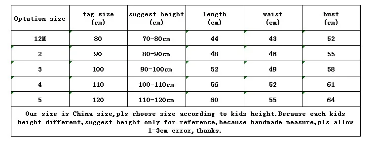 Перед заказом, пожалуйста, внимательно проверьте таблицу размеров, наш размер-китайский размер, пожалуйста, выберите размер в соответствии с ростом и весом ребенка. Если вес высокий, пожалуйста, выберите больший размер. Из-за измерения вручную допускается погрешность в 1-3 см.