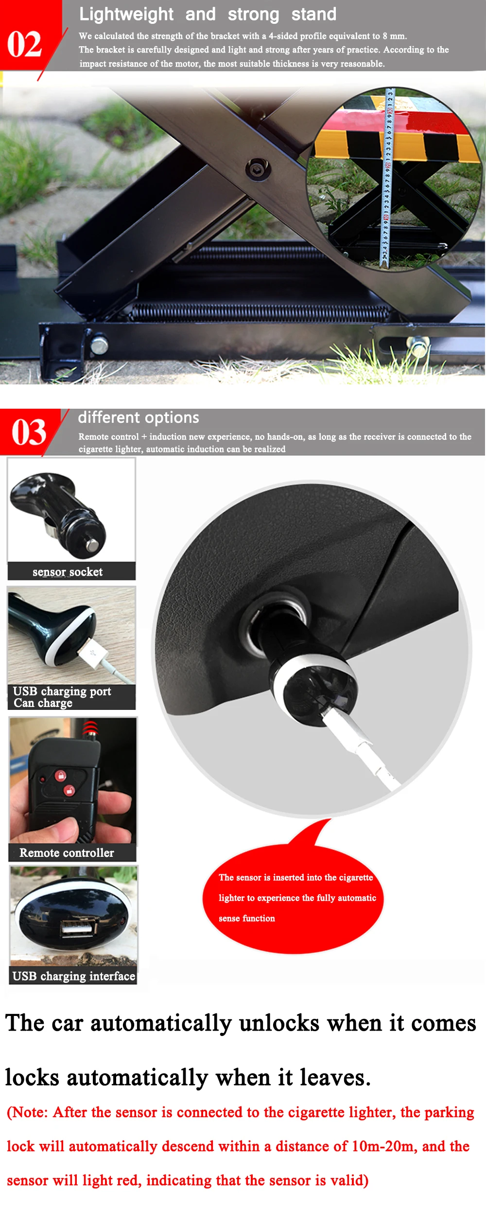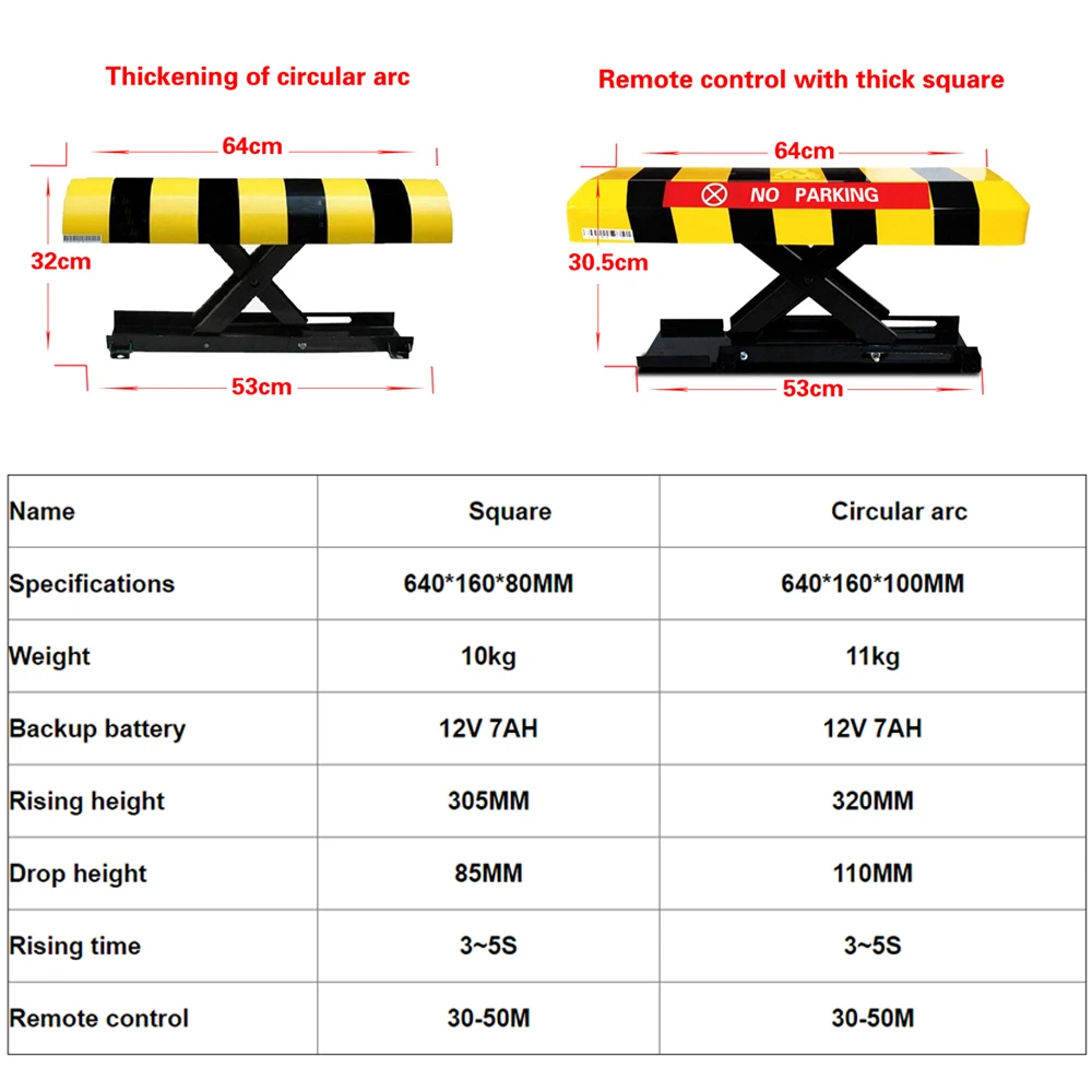 7. Комплектация: один парковочный барьер, два пульта дистанционного управления, одно зарядное устройство, без аккумулятора, 4 крепежных болта, 2 ключа.