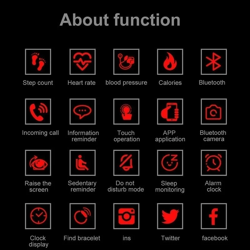 √ Отслеживайте свои ежедневные шаги, потребляемые калории, расстояние, Отслеживайте непрерывный пульс, записывайте продолжительность упражнений, средний темп. Покажите уведомления о входящих звонках, сообщениях и SNS из программного обеспечения социальных сетей. √ Следите за качеством ежедневного сна, скажите, как долго и как хорошо вы спите ночью. Установка будильника и оповещение о малоподвижности могут бесшумно напоминать вам просыпаться, принимать лекарства или выполнять некоторые упражнения. √ Сравните свой спортивный маршрут в приложении, следуя подключенному gps-трекеру, вы можете увидеть среднюю скорость, расстояние активности, маршрут тренировки, потребление энергии в приложении. (Только для ходьбы и бега.) √ 0,96 большой oled-экран с 4 индивидуальными циферблатами часов. Удобный, модный, регулируемый ремень с защитой от потери для милых детей, спортивных мужчин и деловых мужчин. √ 14 спортивных режимов для конкретной деятельности могут удовлетворить ваши потребности весь день. 24 часов в режиме реального времени непрерывной сердечный ритм может дать вам советы для физических упражнений. Поддержка Android 4,0 и выше, iOS 8,0 и выше только для смартфонов
