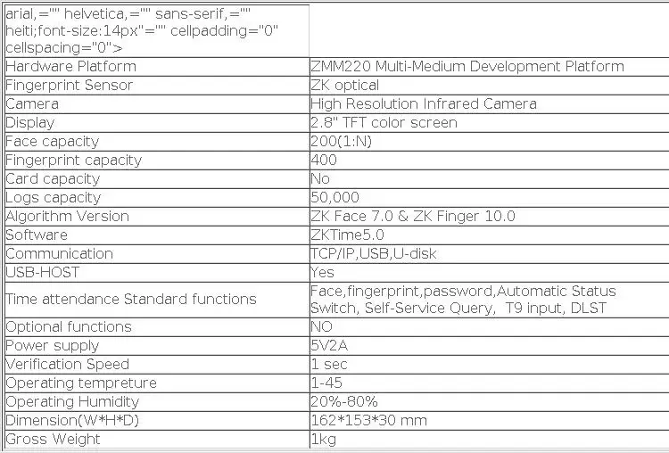 FA200 мульти-Биометрическая идентификация посещаемости времени и контроля доступа принимает zk программного обеспечения последней платформы ZEM220 с zk лицом 7,0 алгоритм и 200 пользователей памяти емкости. Первое устройство zk face с клавиатурой. Мультибиометрический метод идентификации лица, отпечатков пальцев и паролей будет применяться более широко. Все операции UF серьезные созданы для того, чтобы быть выполнена на 2,8 дюймов TFT экран. Мультимодельные коммуникации включают TCP/IP USB, функция SSR позволяет u-диску загружать отчет о посещаемости напрямую.