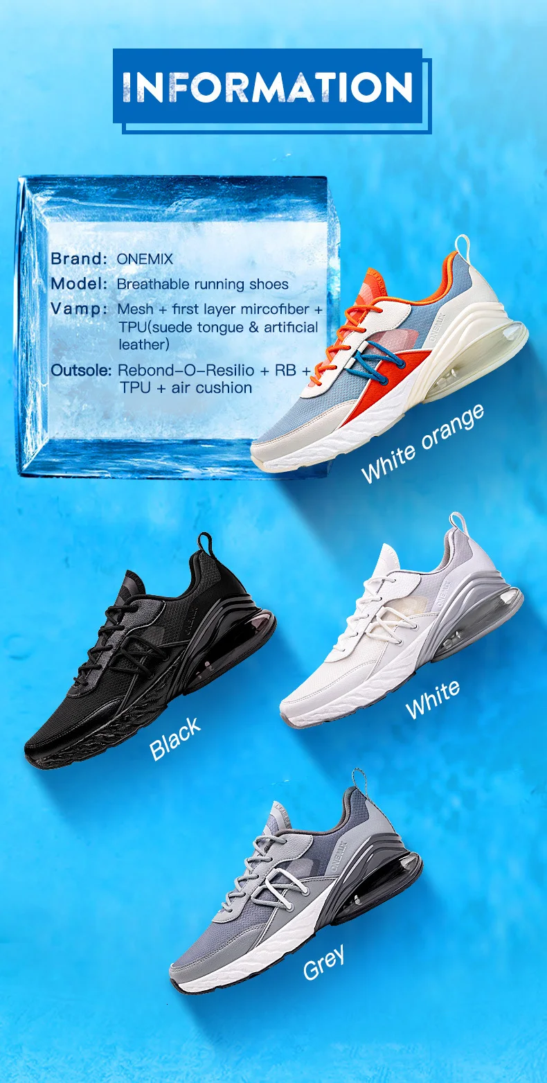 Информация Бренд: ONEMIX Модель: дышащая обувь для бега Передняя часть: сетка + первый слой из прозрачного волокна + ТПУ (замша и искусственная кожа) Подошва: Rebond-O-restoro + RB + TPU + Воздушная подушка