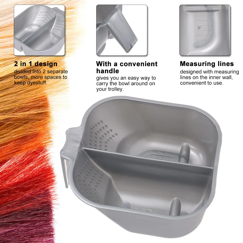 Эта чаша разделена на 2 отдельных чаши, поэтому у вас есть много мест, чтобы сохранить все ваши формулы. С удобной ручкой, дает вам легкий способ носить чашу вокруг на вашей тележке. Отлично подходит для использования в салонах парикмахерских или домашних волос DIY.
