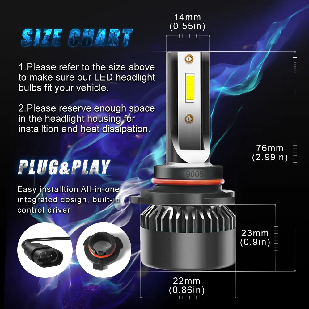 Технические характеристики Источник света: с светодиодные чипы csp Цветовая температура: 6000 K белый Мощность: 100 Вт/комплект (50 Вт/каждая лампа) Люмен: 10000лм/комплект (5000лм/каждая лампа) Светодиодный Количество: 2 шт. светодиодный/каждая лампа Рабочее напряжение (В): 9-32 В постоянного тока Водонепроницаемый скорость передачи данных: IP68 Угол обзора: 360 градусов Рабочая температура:-40 ~ 80 градусов Цельсия Сертификаты: CE, LVD, EMC, ROHS Особенности: 1. Ярче, чем галогенные/ксеноновые лампы белого цвета, более мощные, чем галогенные. 2. Полностью алюминиевый корпус и быстрое охлаждение, обеспечивая безопасный температурный диапазон и длительный срок службы до 30 000 часов 3. Водонепроницаемый: IP68, может использоваться в любых условиях воды 4. Быстрый запуск: быстрое включение/выключение времени отклика 5. Простая установка: все в одной модели, такая же как оригинальная лампочка автомобиля, подключи и играй Преимущества по сравнению с HID и галогенными лампами: Светодиодный VS HID Быстрое включение/выключение, без "разогрева" Светодиодный VS галогенные лампы 70% Энергосбережение и в 3 раза дольше Посылка включает в себя: 2x светодиодный лампы для передних фар