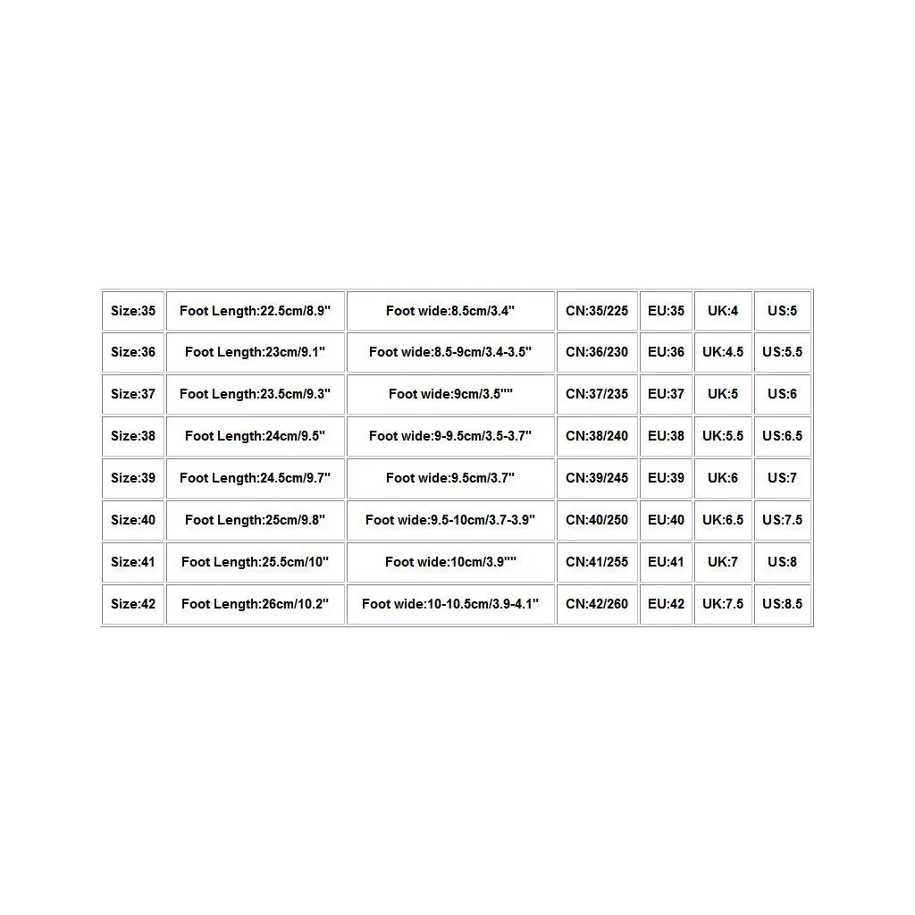 Размер Длина стопы Широкая стопа CN ЕС Великобритания США 35 22,5 см/8,9 дюйма 8,5 см/3,4 дюйма 35/225 35 4 5 36 23 см/9,1" 8,5-9 см/3,4-3,5 дюйма 36/230 36 4,5 5,5 37 23,5 см/9,3 дюйма 9 см/3,5 "" 37/235 37 5 6 38 24 см/9,5 дюйма 9-9,5 см/3,5-3,7 дюйма 38/240 38 5,5 6,5 39 24,5 см/9,7 дюйма 9,5 см/3,7 дюйма 39/245 39 6 7 40 25 см/9,8 дюйма 9,5-10 см/3,7-3,9 дюйма 40/250 40 6,5 7,5 41 25,5 см/10" 10 см/3,9 "" 41/255 41 7 8 42 26 см/10,2 дюйма 10-10,5 см/3,9-4,1 дюйма 42/260 42 7,5 8,5