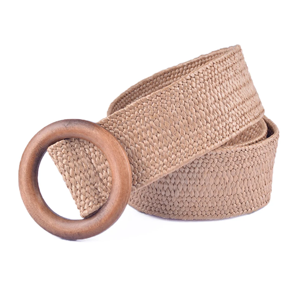 Round Wooden Buckle Elastic Straw Belt Women Casual Braided Wide Woven Waistband