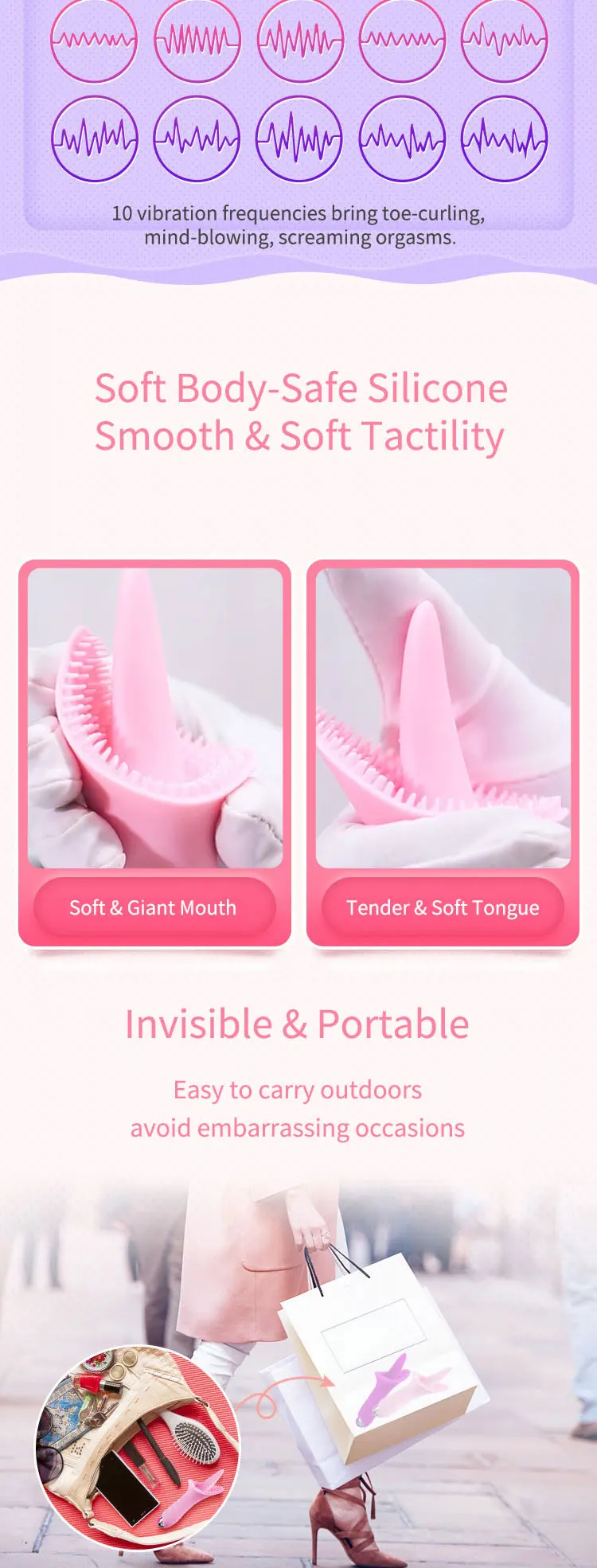 1. 100% новый и высокое качество. 2. Он изготовлен из безопасного для тела материала, нетоксичный, приятный для кожи и надежный. 3. Одновременно внутренняя и внешняя стимуляция, а также мощный двигатель. 4. Чрезвычайно гибкий удлиненный язык, вылизывающий во влагалище и стимулирующий G-spot. 5. Изогнутая форма идеально подходит для вашей вульвы и стимулирует клитор. 6. 10 регулируемых частот вибрации от деликатной стимуляции до интенсивной стимуляции обеспечивает дующий ум, завивание ног. 7. Всегда готовы к новым трюкам, идеальной игрушке для флирта. 8. Невидимый и портативный, легко носить с собой на открытом воздухе, не вызывая каких-либо неприятных случаев. 9. Эффективно регулировать эндокрин и повышать качество сексуальной жизни. 10. Водонепроницаемый корпус. 11. Зарядка от USB.