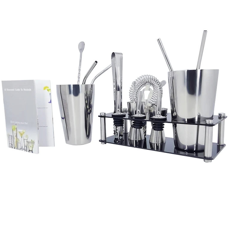 Набор включает в себя необходимые для смешивания напитков, поставляется с подставкой с прорезями для удобного хранения