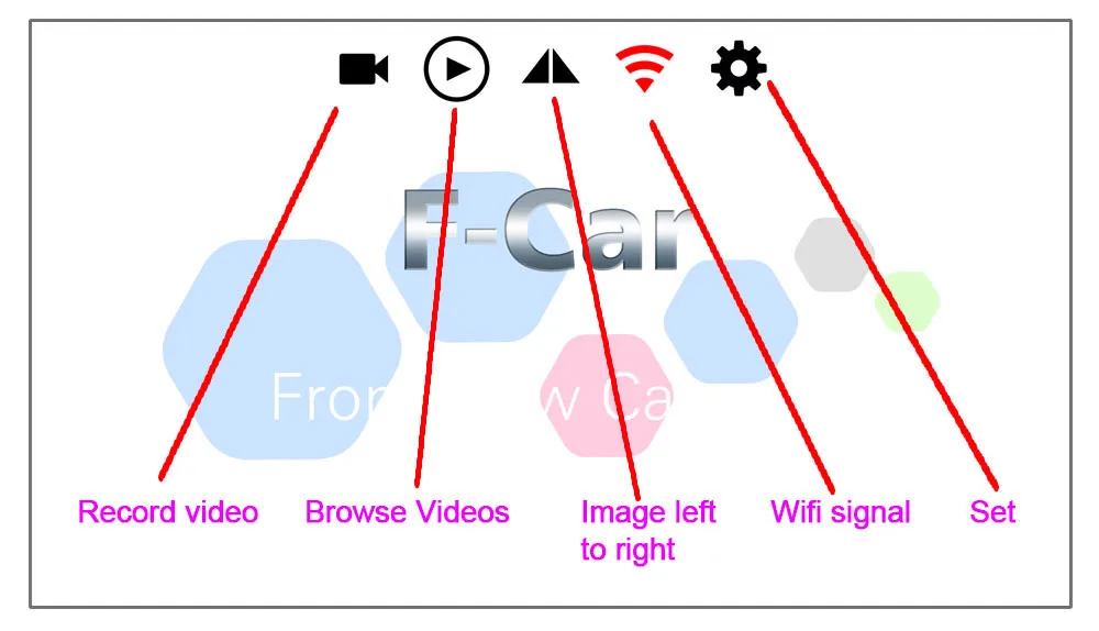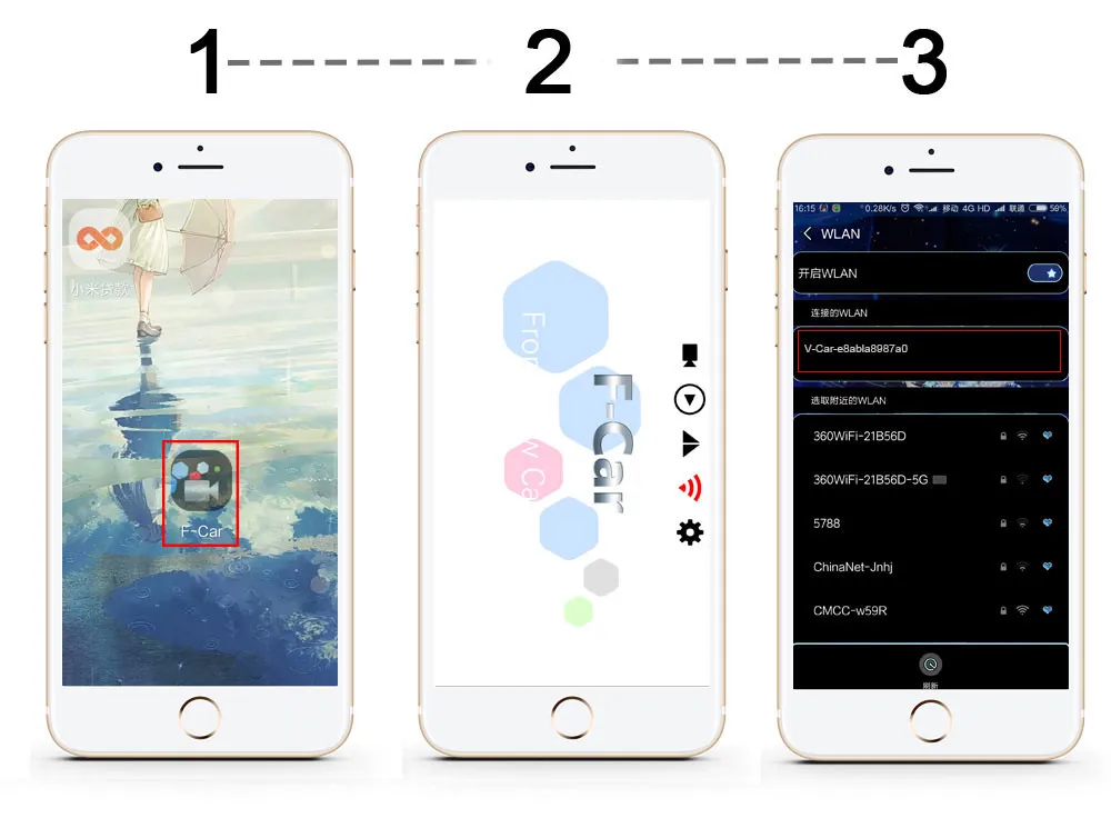 ① Установите специальное приложение F-car на свой телефон ②откройте приложение и нажмите на значок wifi