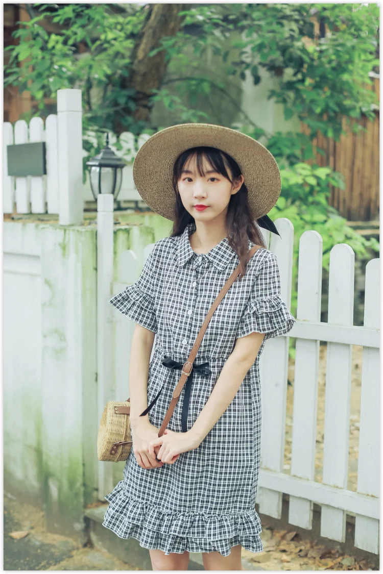 Женское клетчатое платье в японском стиле, милое Повседневное платье с коротким рукавом, 2019